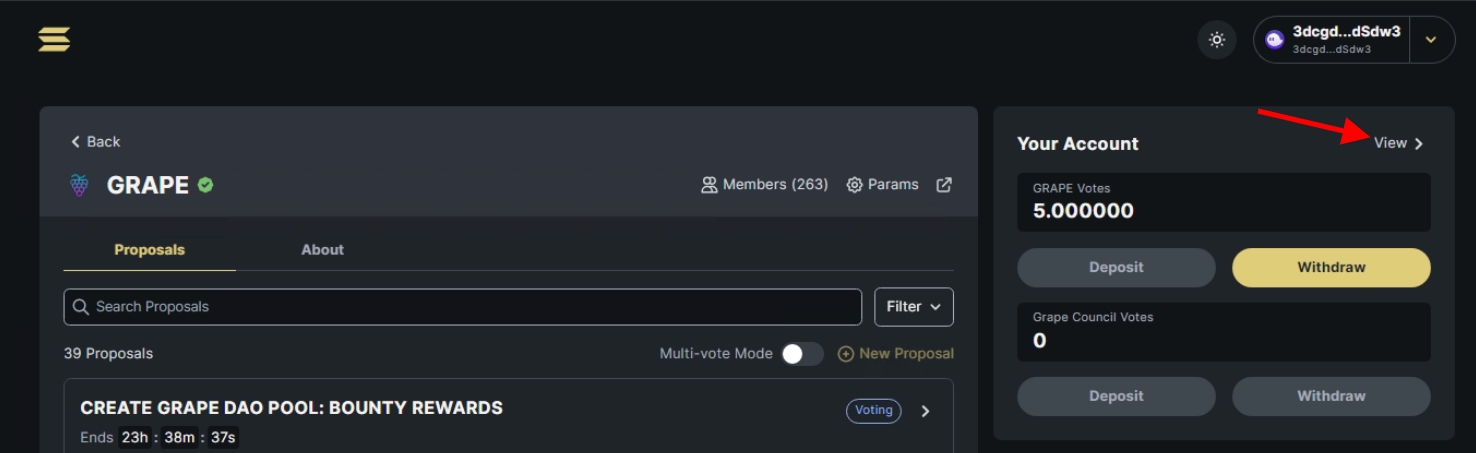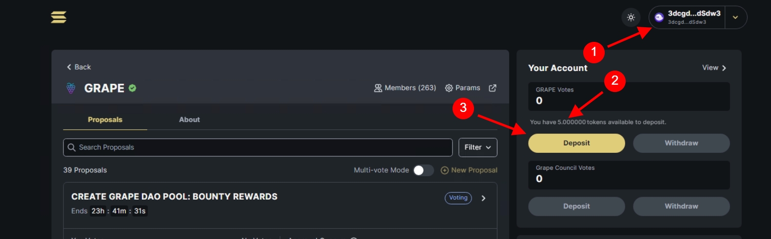 Before you can take part in the voting process on realms, you need to deposit $GRAPE in your account. Depositing your $GRAPE on realms is also a requirement to be eligible for any Membership Rewards.