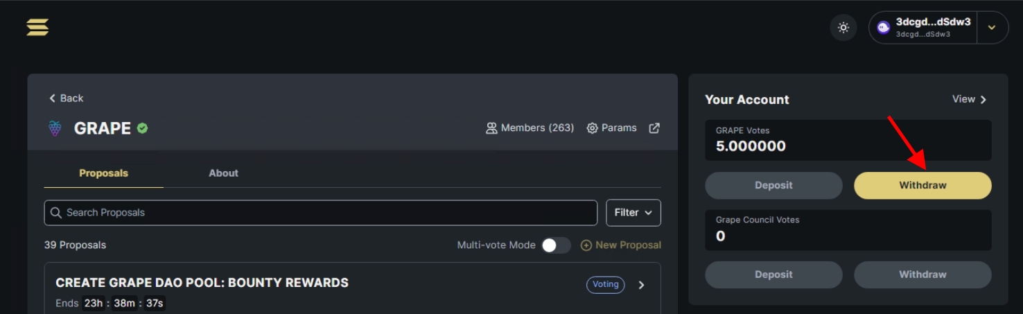 If the withdrawal fails, it may be that your $GRAPE are still locked in an active vote. Try and release them first (see below).