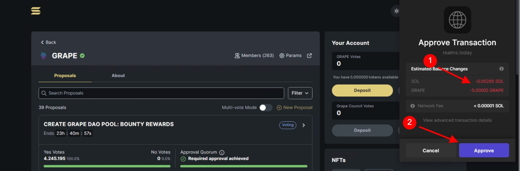 By clicking 'Deposit' you need to approve the transaction. Be aware that you need some $SOL in your wallet [1] in order to proceed. Approving [2] the transaction will deposit all your $GRAPE in realms.